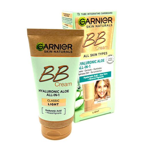 بی بی کرم آبرسان هیالورونیک گارنیه Garnier حاوی هیالورونیک و آلوئه ورا ، که برای انواع پوست مناسب است. آبرسانی، محافظت در برابر نور خورشید را فراهم می کند و رنگ پوست را کاملا یکدست می کند.