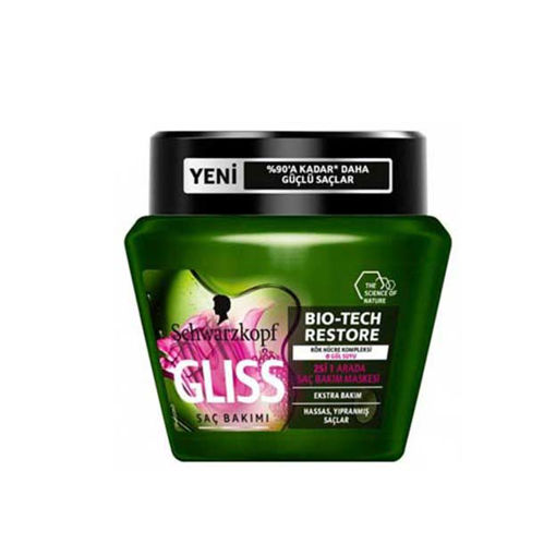 ماسک موی گلیس  Gliss سبز مدل Bio-Tech Restore برای ترمیم و درمان مو تولید شد. ماسک مو گلیس دارای فرمولاسیون عالی برای درمان ساقه و ریشه موی آسیب دیده طراحی شده است. برای درمان بیش از 90 درصد مو های شکسته و وز قابل استفاده است. ماسک مو گلیس در برابر عوامل محیطی از مو های شما مراقبت می کند. عوامل محیطی مانند رادیکال های آزاد و اشعه های مضرر خورشید می باشد.