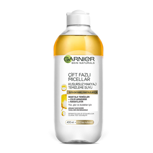 میسلار واتر دو فاز گارنیه Garnier ، دارای یک فاز طلایی رنگ است. و علاوه بر آن ، سرشار از روغن های مغذی و روغن آرگان میباشد که موجب تغذیه و تقویت پوست میشود.