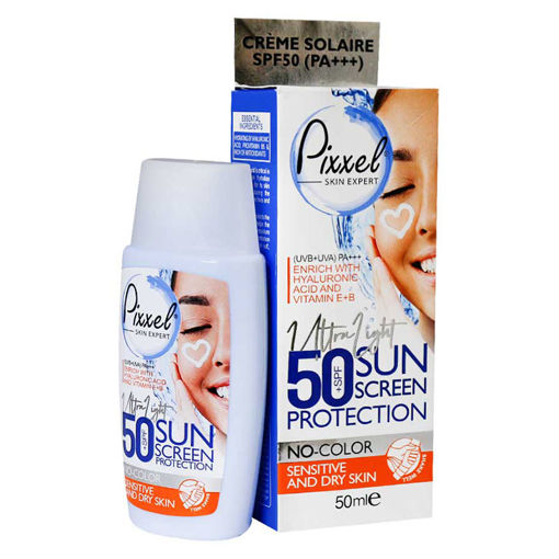 کرم ضد آفتاب بی رنگ پوست خشک و حساس پیکسل Pixxel با SPF50 بر پایه آب بوده که با بافت سبکی که دارد از پوست محافظت کرده و باعث آبرسانی پوست خشک می‌شود.