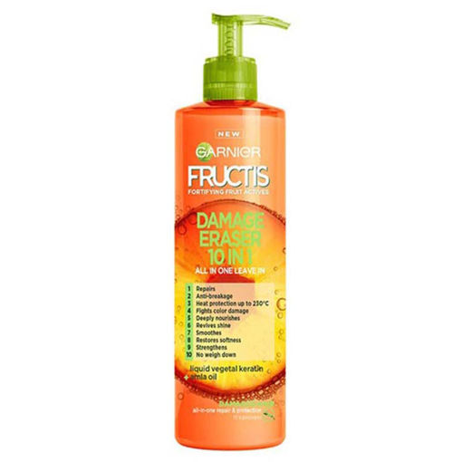 کرم موی ترمیم کننده 10 کاره گارنیه مدل Goodbye damage 10-in-1 Garnier ضد وز و ضد موخوره می باشد، این کرم حاوی آمینو کراتین مایع جهت ترمیم مو است. کرم موی ترمیم کننده 10 کاره گارنیه محصولی همه کاره است که ترمیم کننده آسیب دیدگی و مراقبت کننده مو در برابر عوامل آسیب رسان می باشد. کرم موی گارنیه حاوی آمینو کراتین مایع جهت تقویت و ترمیم ساختار مو و روغن میوه املا جهت تغذیه و نرمی موها است، نتیجه موهایی منظم و شانه پذیری آسان مو همراه با نرمی و سلامت آن است.